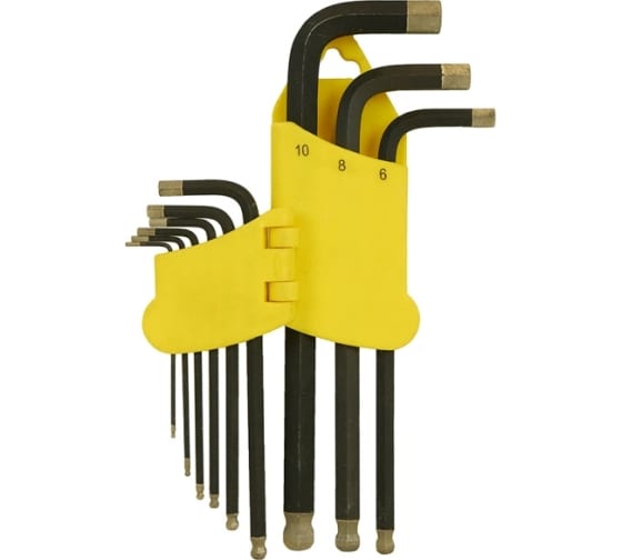 Набор шестигранных ключей предназначен для слесарных и монтажных работ в быту, является универсальным инструментом для работы с наиболее распространенными размерами крепежных изделий. Г-образная форма увеличивает крутящий момент. Набор размещается в пластиковом футляре, который удобен для хранения и транспортировки. Рабочая часть выполнена из стали марки S2, наконечник с алмазным покрытием, что обеспечивает прочность и износостойкость.Наличие