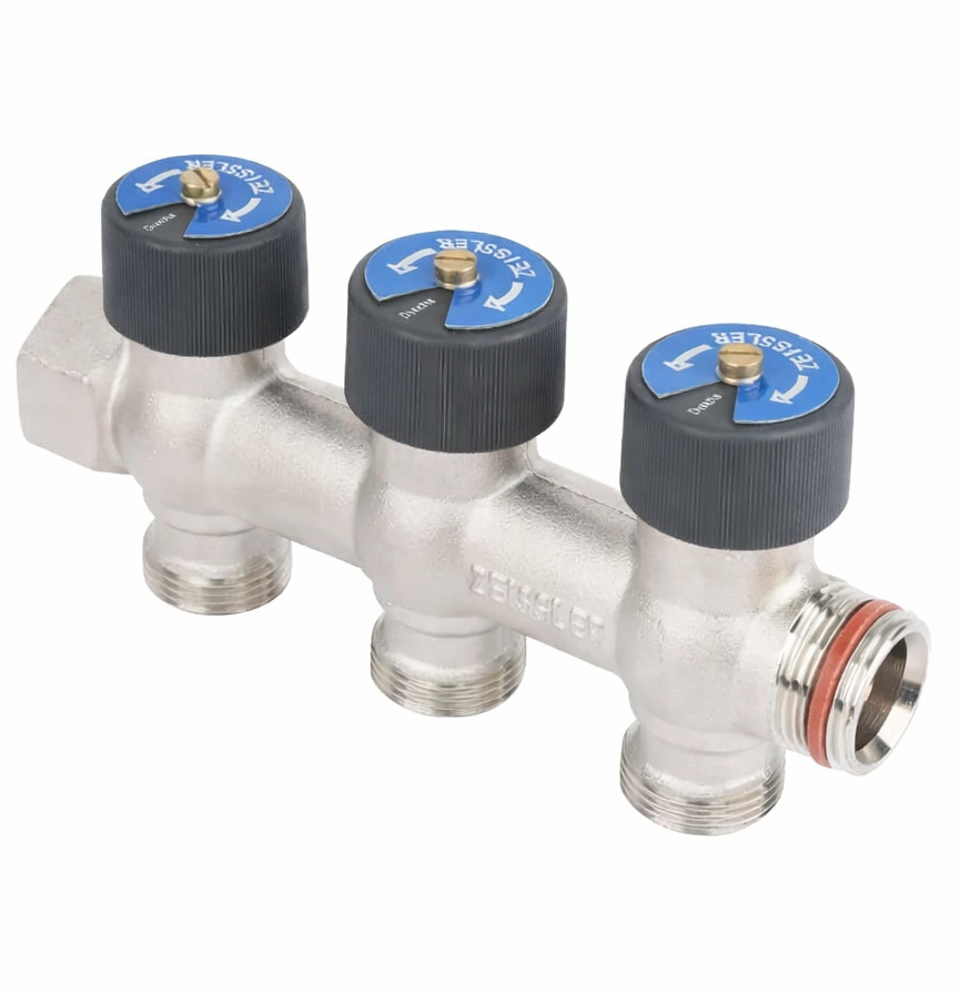 Коллектор распределительный с плавной регулировкой никелированный 3 вых. 3/4 х 3/4 Евроконус ZEISSLERРаспределительный коллектор ZEISSLER предназначен для систем холодного и горячего водоснабжения и соответствует европейским требованиям к компонентам питьевых водопроводов. Подходит для применения как в частных домах, так и в многоквартирных зданиях.