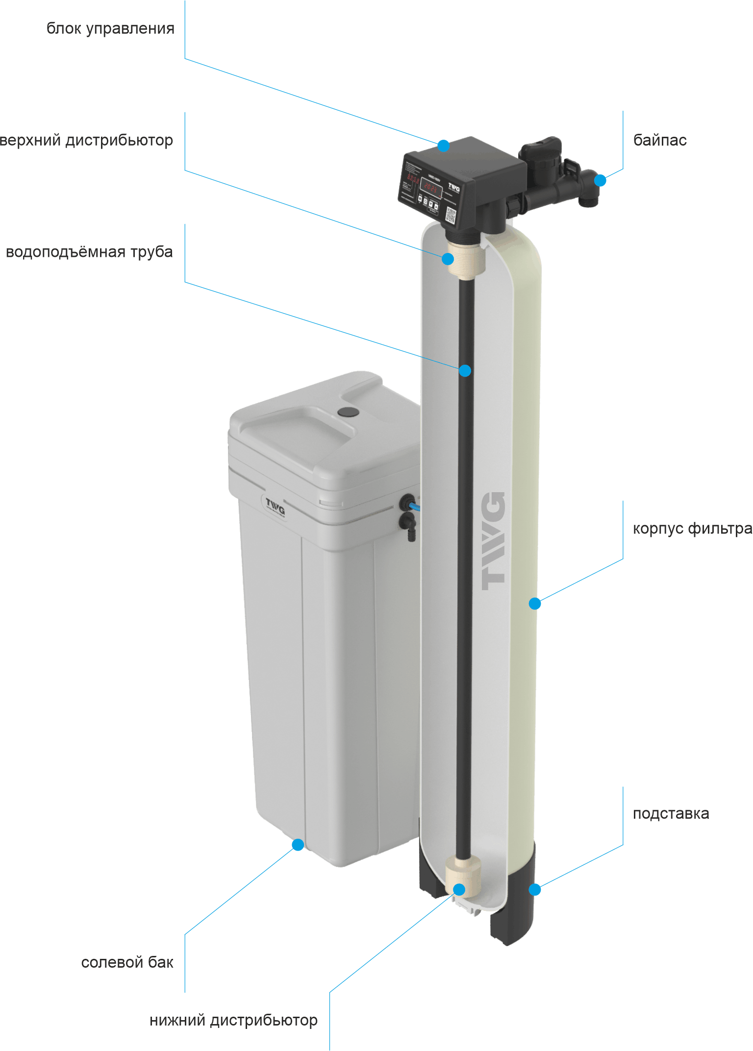 Коттеджная система очистки воды TWG 1252-VR5D-100VB предназначена исключительно для частного использования в целях очистки (доочистки) воды из допущенных к использованию подземных и централизованных источников водоснабжения для бытовых и технических нужд в автоматическом режиме.Производительность номинальная, м3/ч (не более) Qном - экобрайт комплекс 1,5 / экобрайт умягчение 1,8
