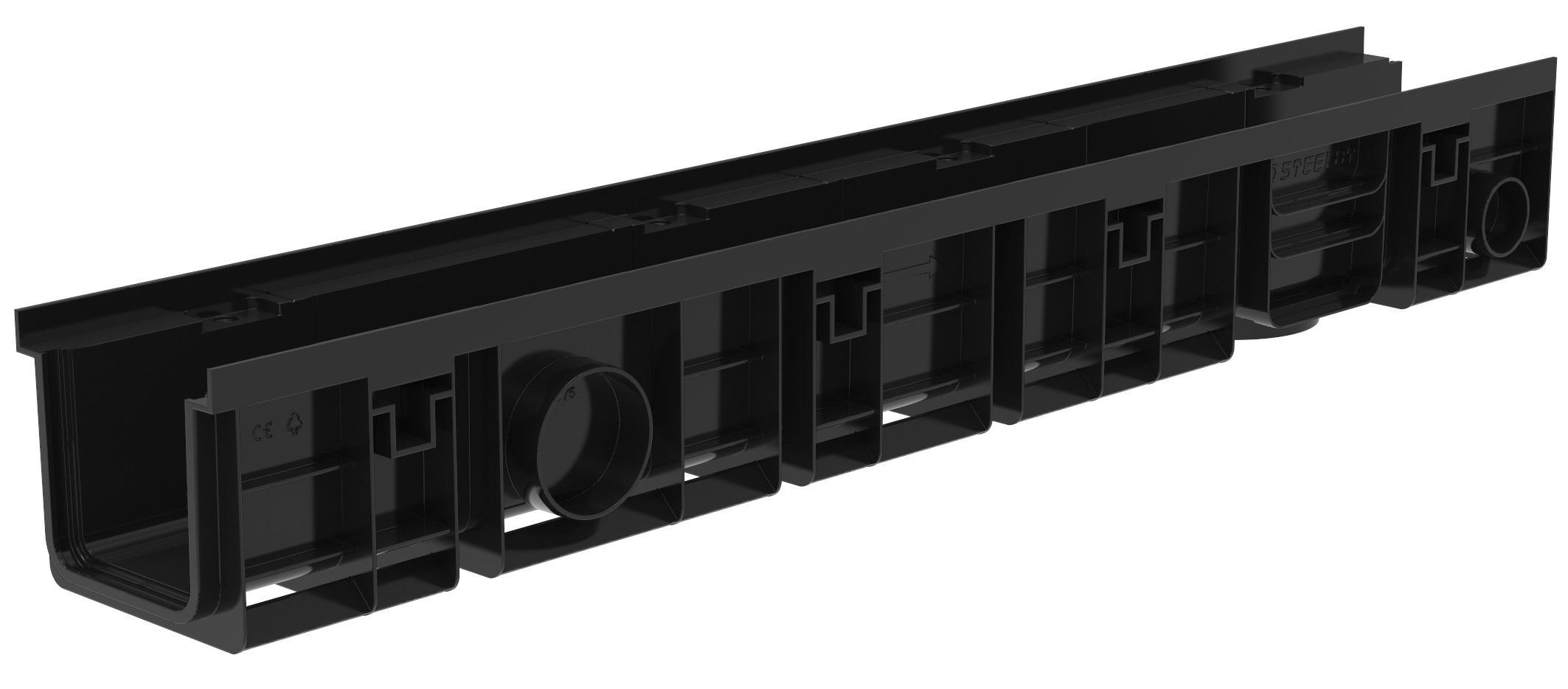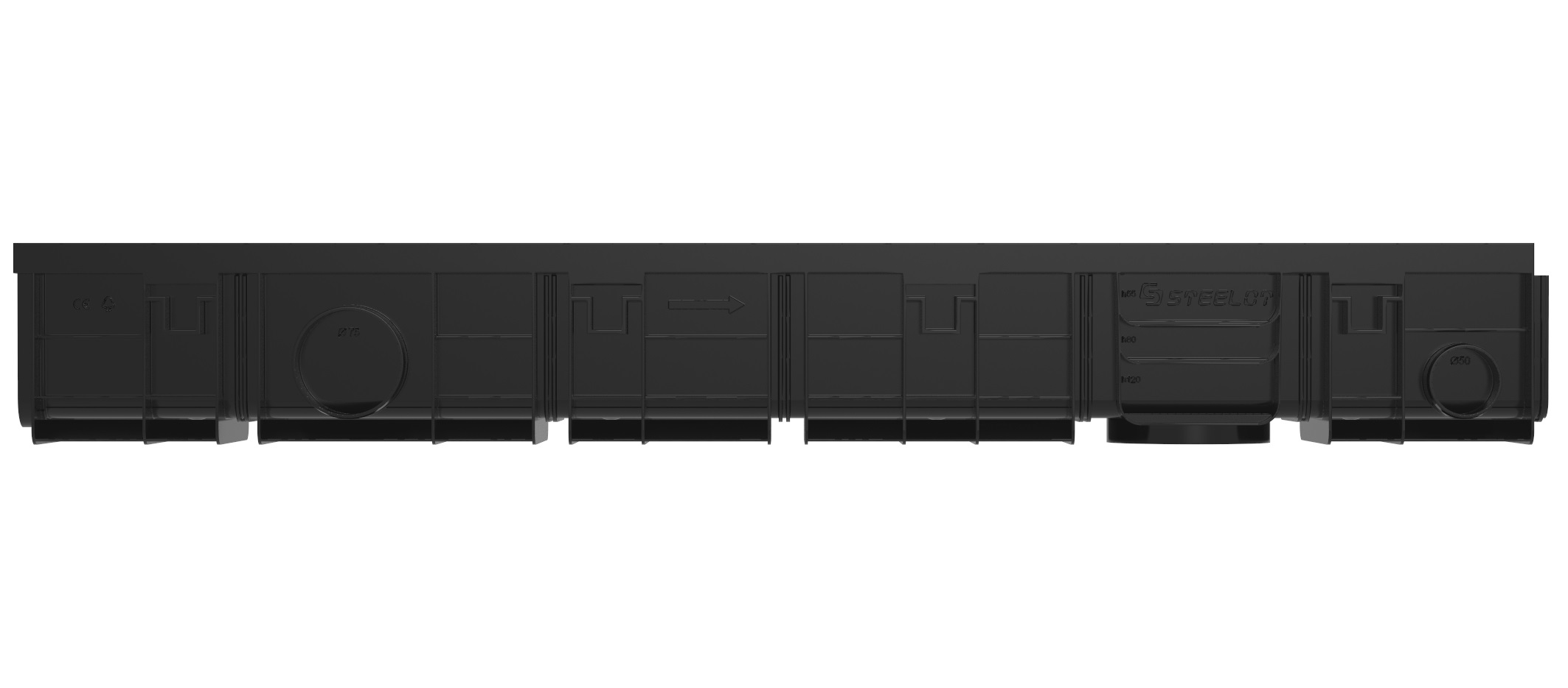 Водоотводные пластиковые лотки серии SteeStart DN100 имеют 5 мест предусматривающих разрез водоотводных лотков для регулировки длины, также в конструктиве предусмотрены технические заготовки для подсоединения отводных канализационных труб диаметром от 50 до 110 мм.