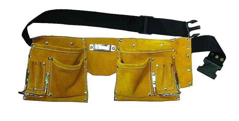 Пояс для инструмента, натуральная кожа, 8 карманов, 2 скобы. В комплект пояса входят две поясные сумки из натуральной кожи с карманами разных размеров, а также металлический держатель для подвешивания молотка. Длина ремня может быть отрегулирована для более комфортного использования.Наличие