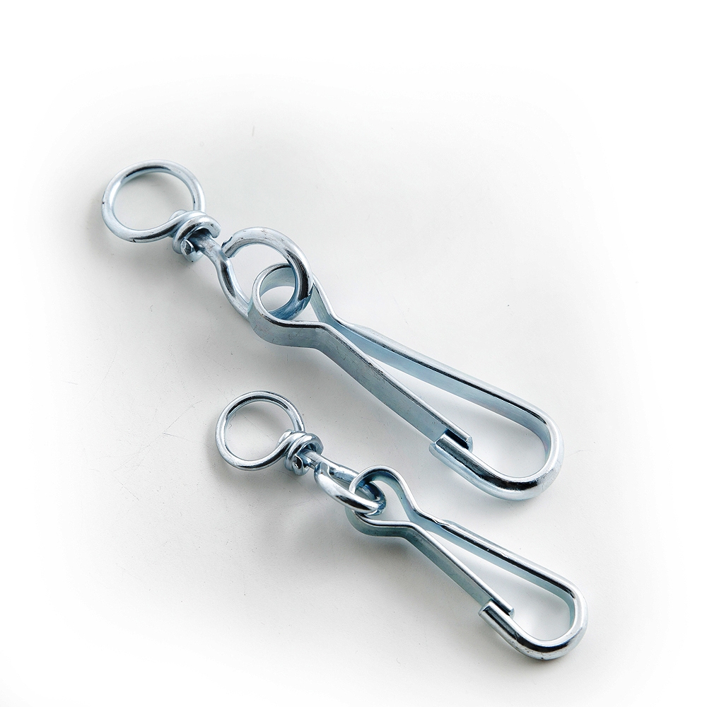 Карабин с вертлюгом тип А – простейшее такелажное приспособление на пружинной защелке, предназначенное для захвата звена цепи, петель веревок, ремня и их крепления к другим объектам. Он не препятствует свободному вращению соединяемых элементов и предотвращает их перекручивание в процессе работы.Наличие