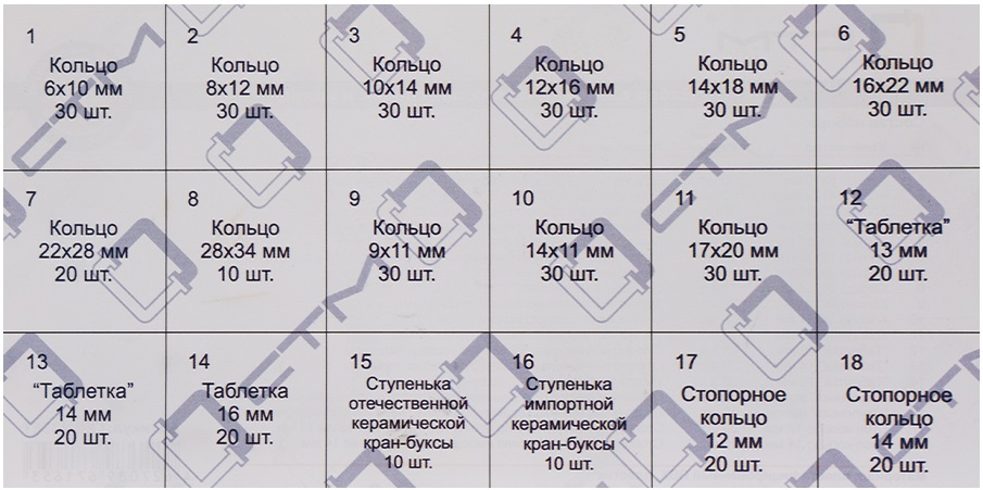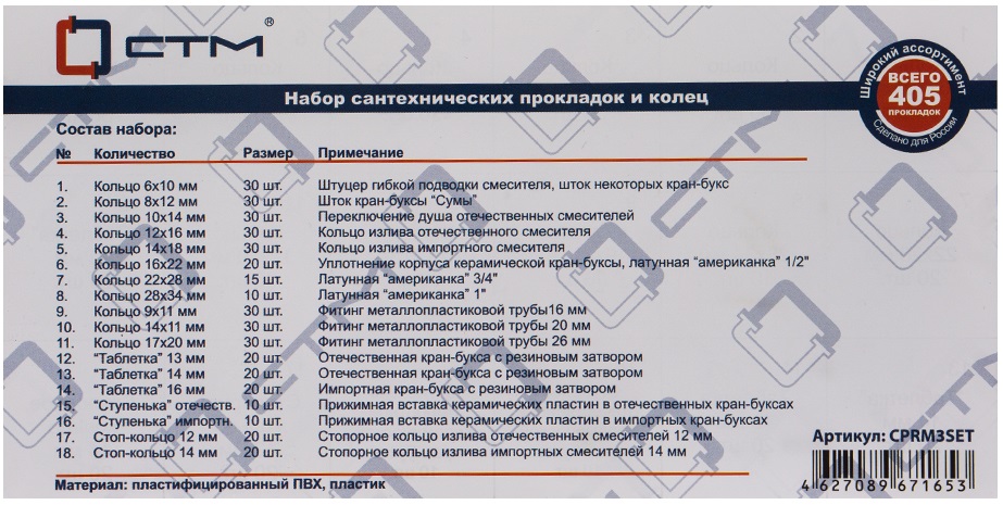 Набор сантехнических прокладок для смесителя "Сантехник" №3 в боксе СТМ предназначен для ремонта и уплотнения различных соединений:1.Кольцо 6х10мм - 30шт.