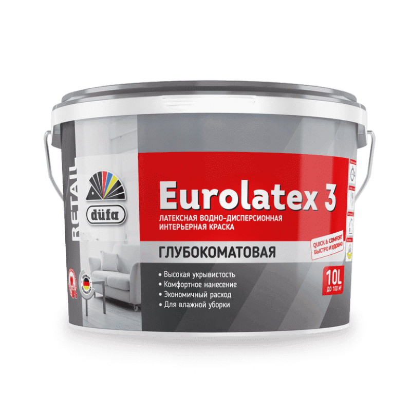 Водно-дисперсионная краска с хорошей укрывистостью для покрытий по бетону, штукатурке, кирпичной кладке, волокнистому цементу, не содержащему асбест, а также для перекрашивания исправных, старых дисперсионных покрытий. Подходит для окраски любых видов прочных, надежно приклеенных влагостойкими клеями обоев на бумажной, флисовой и флисово-виниловой основе. Также можно окрашивать качественно подготовленную поверхность стеклообоев, малярного флиса, стеклохолста различной плотности (поверхность следует загрунтовать грунт-краской или пропитать обойным клеем для формирования равномерно впитывающего малопористого основания).Наличие