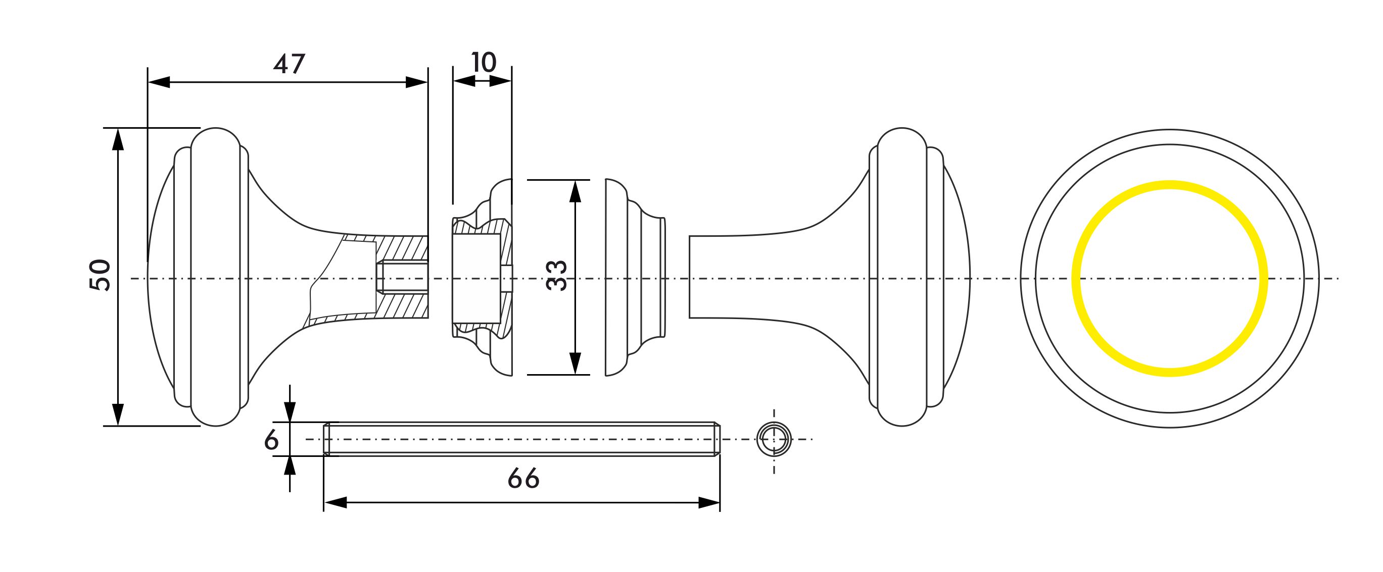 Ручка-кнопка дверная. Материал - пластик. В комплекте соединительный штырь-винт длиной 100 мм. В центре ручки окантовка в виде золотого кольца.Характеристики