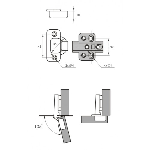 Металлический механизм, позволяющий закрывать и открывать мебельные фасады. Конструкция состоит из чаши, плеча и планки.Наличие