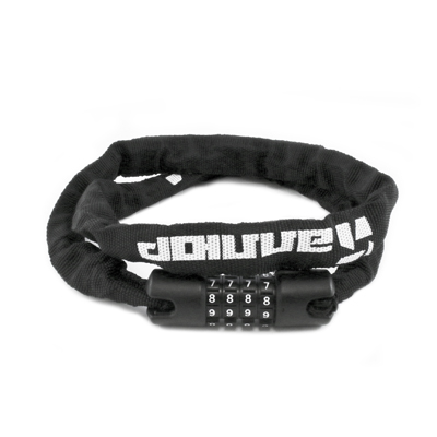 Замок навесной с цепью. Материал корпуса - сталь, покрыта пластиком. Стальная цепь в тканевой оплетке препятствует перекусыванию замка.Длина - 900мм. Кодовый механизм секрета (4 ячейки/10 цифр). Предназначен для запирания дверей, ворот, а также для предотвращения хищения велосипедов, детских колясок, санок, лодочных моторов и др. предметов.Наличие