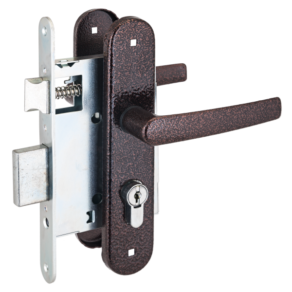 Замок врезной с ручками, цилиндровый. Предназначен для установки в деревянные двери толщиной 40-50мм, правого и левого открывания. Стальной оцинкованный корпус. Прямоугольный ригель из цинкового сплава, вылет 22мм. Межосевое расстояние 55мм. Удаление ключевого отверстия 55мм. Габаритный размер 85х130 мм. Ручки - алюминиевый сплав, покрытие - краска, без пружины, крепление - стяжками. Комплектуется цилиндровым механизмом 70мм с 4 ключами.Наличие