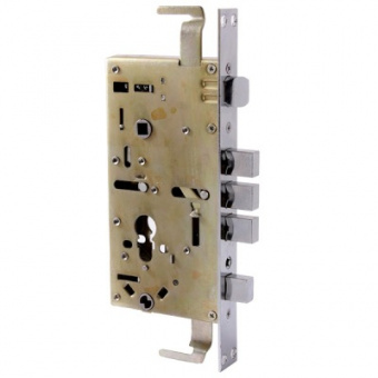 Замок врезной цилиндровый с защелкой и задвижкой, без механизма секрета. Предназначен для установки в правые китайские металлические двери, в качестве основного замка. Замок закрывается снаружи автоматически, поднятием ручки вверх. Три прямоугольных стальных ригеля. Вылет ригелей 20мм. 3 точки запирания. Корпус замка - сталь, толщиной 1,1мм. Удаление ключевого отверстия 60мм. Межосевое расстояние 68мм. Расстояние от центра механизма секрета до задвижки 52мм. Цвет торцевой планки - хром, ширина 24мм.Наличие