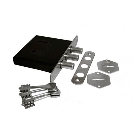 Замок врезной сувальдный для металлических дверей. Засов из трех цилиндрических ригелей диаметром 16 мм, с максимальным вылетом 30 мм. Удаление ключевого отверстия 77 мм. Габариты замка - 114х120х23мм. Комплектация - 4 ключа, ответная планка, накладка и поворотная ручка.Наличие