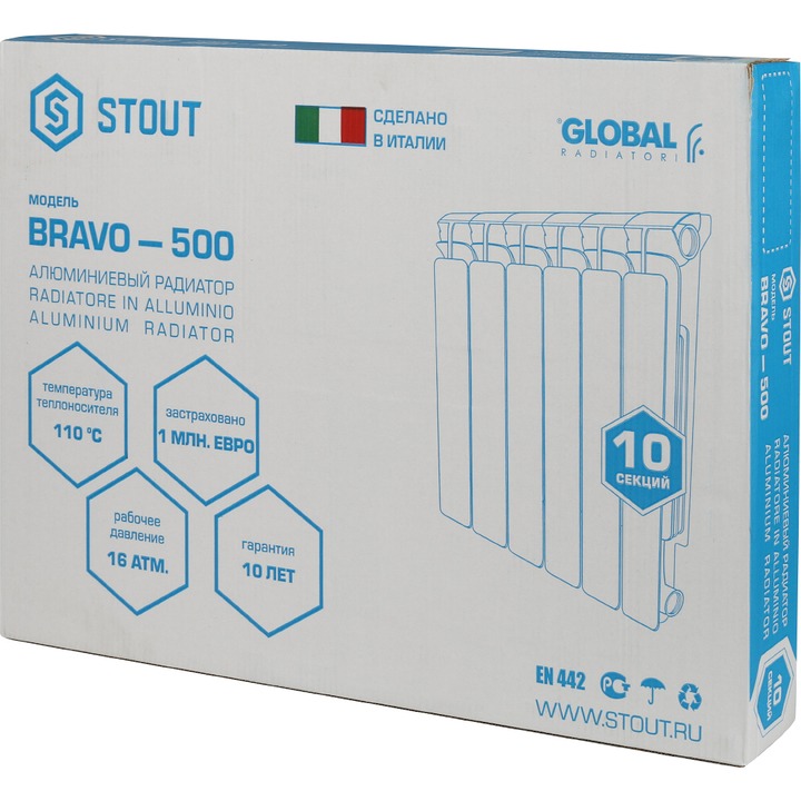 Радиаторы STOUT Bravo/Bravo Ventil собираются из отдельных секций, которые изготавливаются из качественного алюминиевого сплава методом литья под давлением. Наружная поверхность секции радиатора окрашена порошковой эмалью белого цвета (RAL 9010).Каждая секция представляет собой единый монолит из двух коллекторов и связывающего их оребрения,