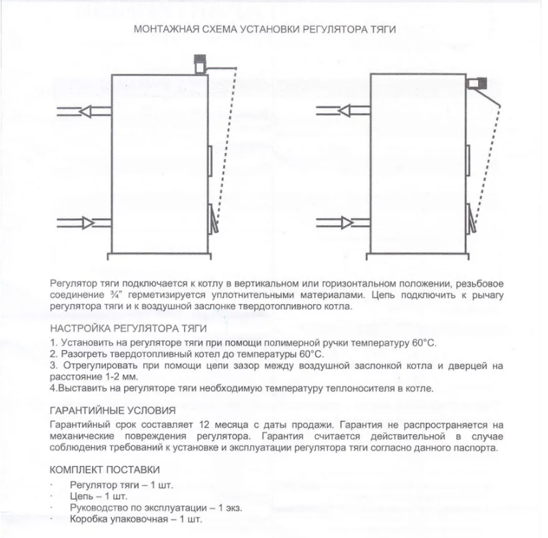 ? В комплект поставки входит: регулятор тяги твердотопливного котла 3/4; инструкция по установке и эксплуатации.