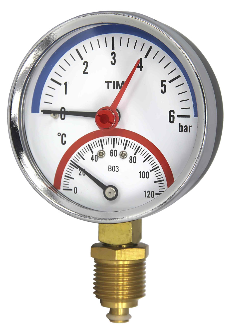 Термоманометр радиал. (нижн.подкл) с авт.запор. клап. Корп. Dn 63 мм, 1/2", 0-6 bar, 0-120°С, TIM
