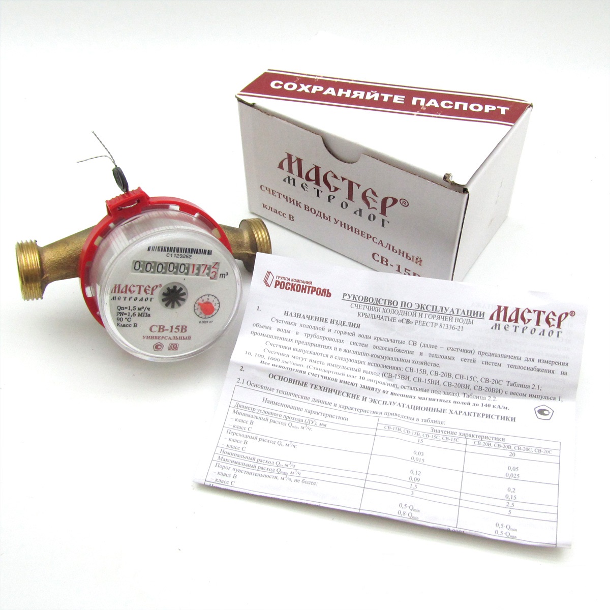 Счетчик универсальный «Мастер Метролог» СВ-15В (Ду=15) предназначен для измерения объема воды в трубопроводах систем водоснабжения и теплоснабжения. Принцип действия счетчика основан на измерении числа оборотов крыльчатки, вращающейся под действием потока протекающей воды. Количество оборотов крыльчатки пропорционально объему воды, протекающей через счетчик. Счетчик оснащен защитой от внешних магнитных полей. Интервал между поверками – 6 лет.Метрологический класс В.