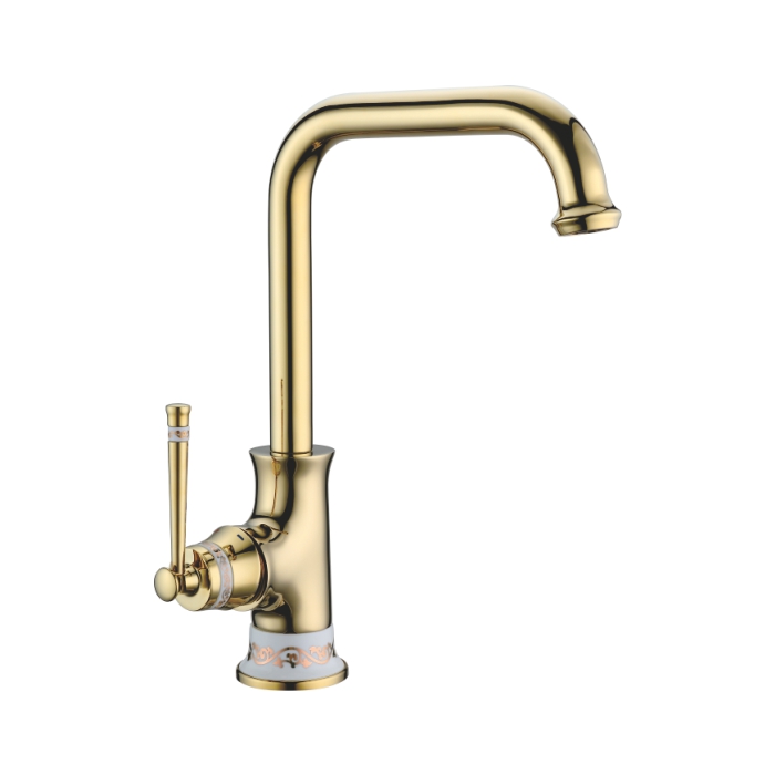 Высокий смеситель для кухни с поворотным изливом в цвете Золото прекрасно дополнит интерьер вашей кухни, придаст благородство и изысканность.Преимущества: