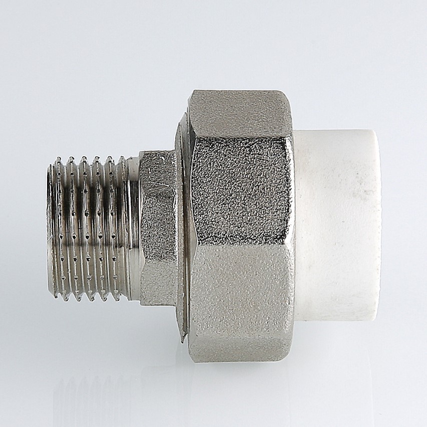 Разъемный полипропиленовый фитинг с переходом на наружную резьбу(VTp.761.0) Металлопластиковый фитинг для создания разъемного, с использованием накидной гайки, соединения полипропиленового трубопровода с трубопроводом или арматурой из других материалов. Уплотнительное кольцо выполнено из синтетического каучука EPDM. Резьба фитинга – наружняя трубная по ГОСТу 6357.