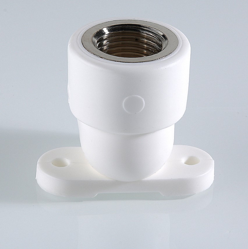 (VTp.754.0) Комбинированный угловой фитинг с креплением (полипропиленовая водорозетка), предназначенный для подсоединения к полипропиленовому трубопроводу сантехнического смесителя или другого компонента инженерной системы с резьбовым подключением. Резьба фитинга – внутренняя трубная по ГОСТу 6357.Наличие