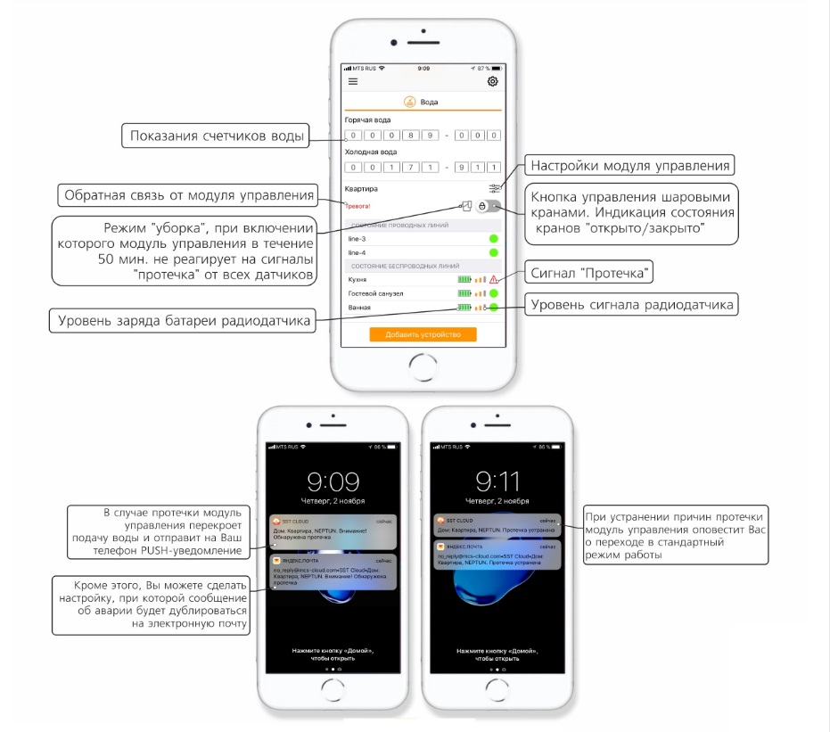 Контроль протечки воды осуществляется автоматически, не требует участия пользователя, а также позволяет проводить мониторинг системы с помощью приложения SST Cloud.